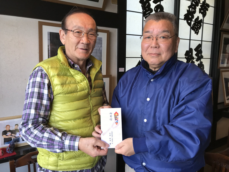平成31年3月29日(金)ちゃんこ萩乃井にて、東松島支部長の大森 宣勝 氏(㈱ちゃんこ萩乃井 代表取締役社長)からNPO法人東松島市体育協会 専務の小山 直美 氏へ石巻法人会を代表し寄付金をお渡ししました。