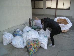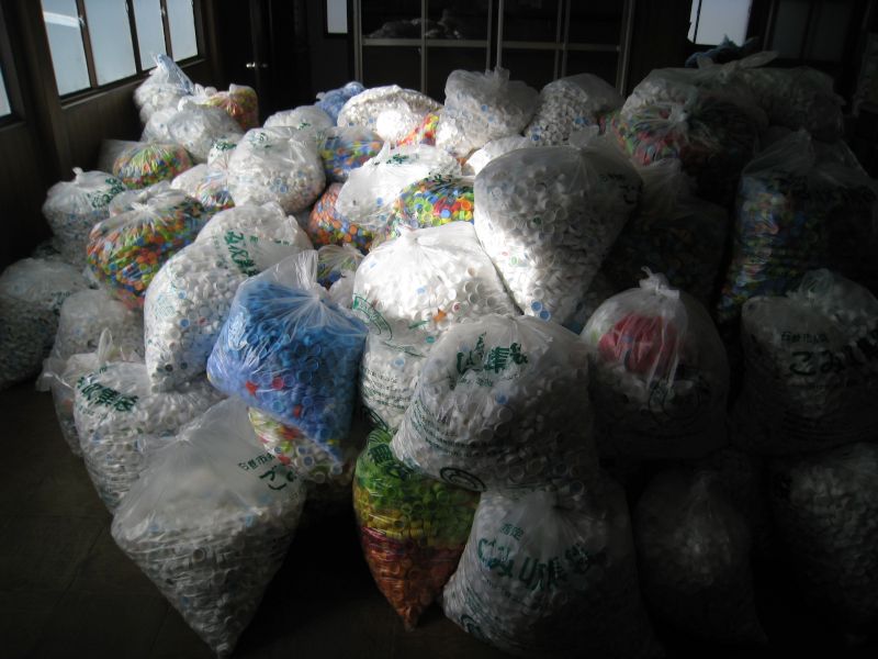 皆様から回収した大量のエコキャップは、青年部会の鶴岡昭雄顧問の所有する倉庫へ一旦保管し、㈱JACへの引き渡し日に写真のように1袋ずつ中身を確認しながら回収バッグに移し替えます。
