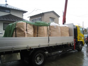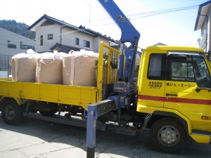 約1t入る袋に移したキャップは㈱JACのトラックへクレーンで積み込み、回収・再活用していただきます。