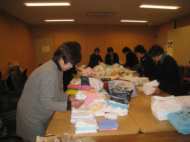 去る、平成27年12月8日(火)石巻ルネッサンス館にて、未使用タオルの寄贈準備を行いました。 「未使用タオルの寄贈活動」は女性部会が主催し、毎年ご協力により集まったタオルを介護施設などに寄贈しております。 今回も呼びかけにご賛同いただいた会員企業様や、新聞の告知をご覧になった市民の方から大変多くのご協力をいただきました。 そのタオルを、女性部会の皆さんが寄贈の準備として未使用のタオルを大きさや色別に分ける作業を行いました。