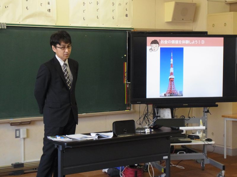 加納副部会長は写真で使用している講義用のスライドも自ら作成しており、今回の租税教室では講師全員がそのスライドを使用して講義を行っています。