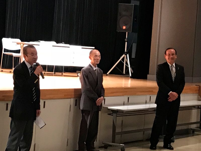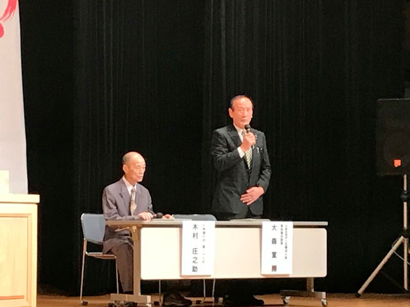 さて、講演ですが畠山氏のご活躍された取組の映像から始まり、大森支部長とのトークでご自身の生い立ちなどを伺ったあと、これまでの大相撲行司人生を時間いっぱいお話いただきました。畠山氏は講演の中で、「バイク事故やがんとの闘病など多くの困難がわが身に降り注いだがこうして元気に過ごすことができていることに感謝しているし、やり残したことは無いと言えるほど一生懸命にこれまで頑張ってきました」と話された。唯一の心残りは、「日本人横綱をさばくことができなかったのと、母に「木村庄之助」としての姿を見られなかったことです」と涙を浮かべながらお話されました。様々な苦労や下積み時代の一生懸命積み上げてきた努力によって現在があるのだという事を会場へ向けてお伝えいただきました。