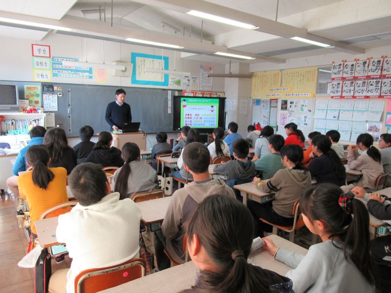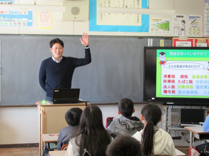 平成30年1月18日(木)石巻市立桃生小学校にて租税教室を開催し、6年生28名の児童の皆さんに「税金は身の回りでどのように役立てられているのか?」について授業を行いました。講師は昨年に引き続き、当部会幹事の岩倉準さん(㈱桃生交通 専務)が務め、サブ講師には、高橋政則さん(㈲高橋建機工業 専務)が同行しました。
