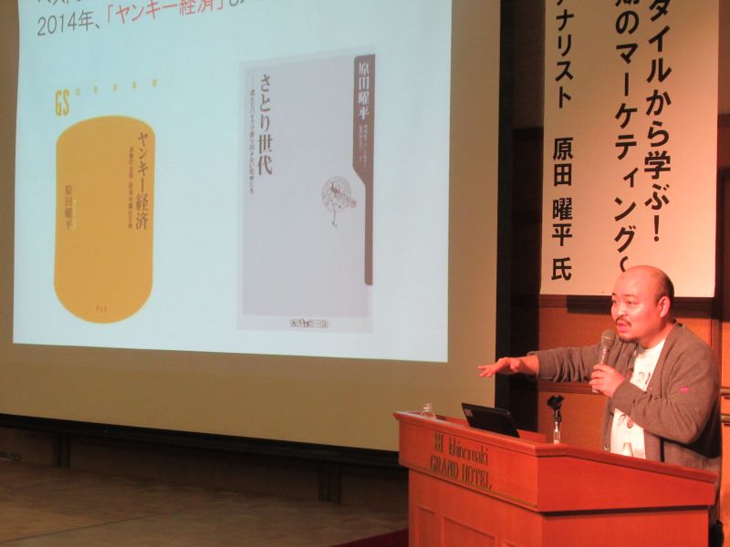 「さとり世代」、「マイルドヤンキー」などの流行語を広め、若者を研究した著書も多数出版されている原田氏は「現在の若者は、ここにいる50歳以上の世代の考え方とは全く異なることを改めて我々も理解する必要があるのだ」と語り、若者はSNSの普及により縦社会より横社会の同年代とのつながりを最も優先して行動しているのだとし、消費行動などに関しての若者目線での考え方などをお話されました。