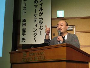つづいて新春講演会が行われ、講師には日本テレビ「ZIP!」などでお馴染みのマーケティングアナリスト 原田 陽平 氏をお招きし、「若者のライフスタイルから学ぶ!〜増税期のマーケティング〜」の演題でご講演をいただきました。