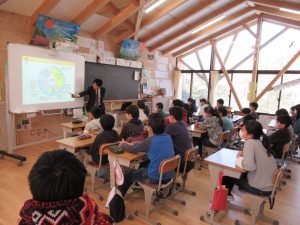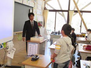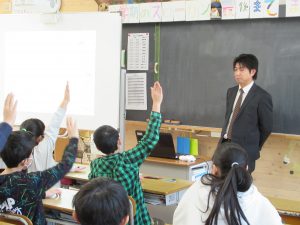 講師の大橋さんは東松島市出身で、会社も東松島市にあるということで「地元で講師が出来るのはとても嬉しい」とお話されていました。今回が初の講師でしたが、「何度もイメージトレーニングをしてきた」との言葉どおり完璧な授業で、児童の皆さんとのやり取りを楽しみながらテンポの良い授業をされておりました。