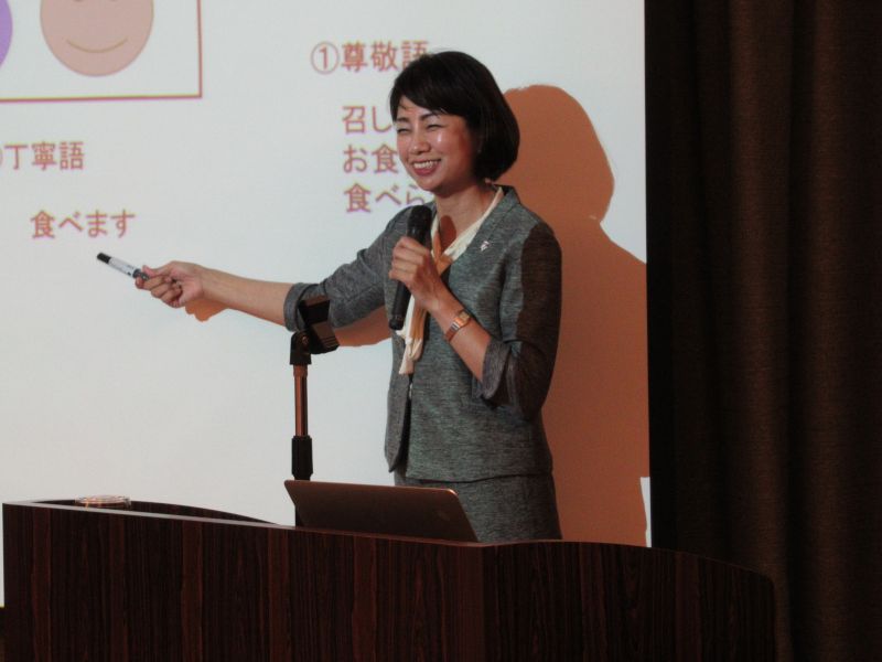 参加者は、接客マナーの「プロ中のプロ」である植田先生より、基本的なマナーについて改めて講義いただいたほか、客室乗務員時代の裏話や美しく見えるしぐさなども交えて大変楽しい講座でありました。