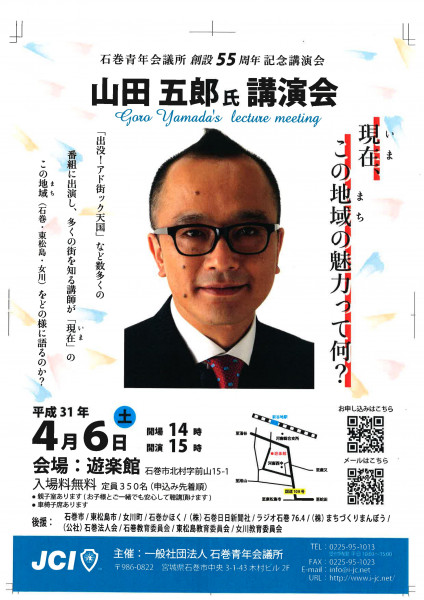 (一社)石巻青年会議所「創設55周年記念講演会」開催のご案内が参りましたので、お知らせ致します。いしのまき圏域が全国に誇れる魅力とは何か?震災以降多様化する圏域の特徴を強みと捉え、地域の可能性を明るく捉えることができる講演会とのことでございます。