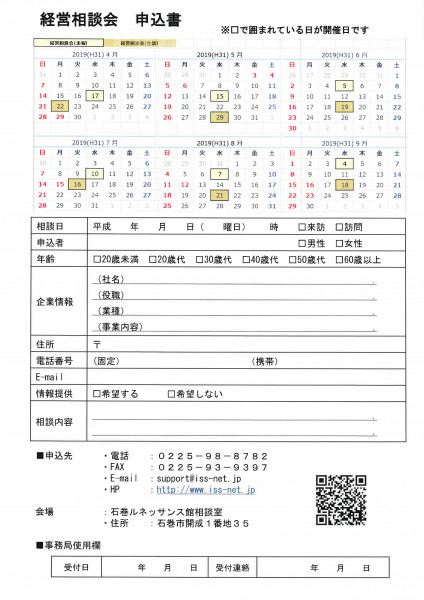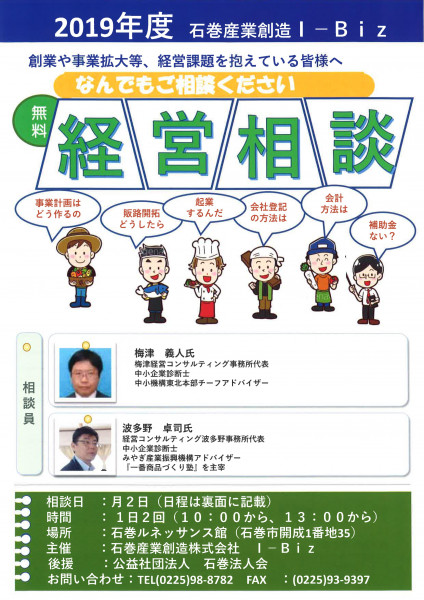 石巻産業創造I-Bizより、創業や事業拡大など、経営課題を抱えている皆様へ向けた 「 2019年度 無料経営相談」のご案内です。