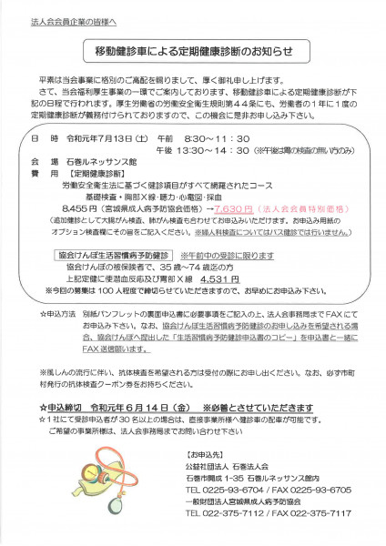 石巻法人会では、毎年3回(7月・9月・11月)移動検診車による定期健康診断を開催しております。
