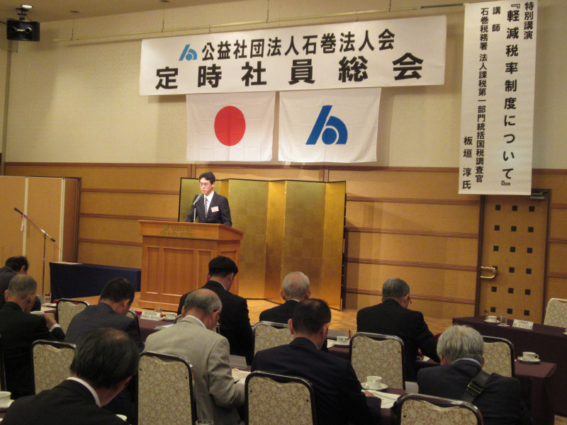 つづいて開催された特別講演会では、講師に石巻税務署法人課税第一部門統括国税調査官の板垣 淳 氏をお迎えし、「消費税軽減税率制度について」という演題でご講演をいただき、一般参加者を含む119名が聴講しました。