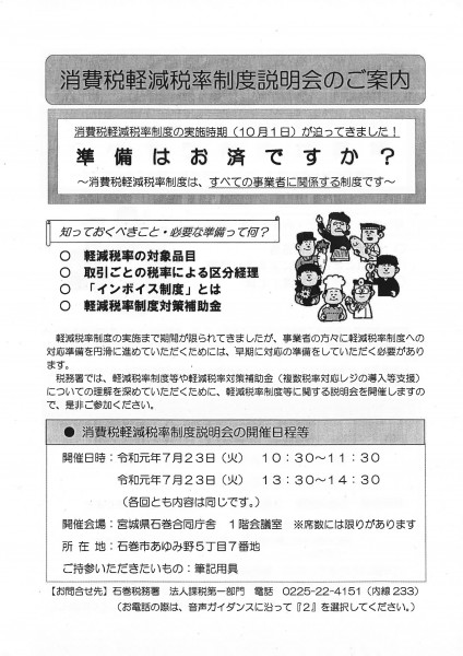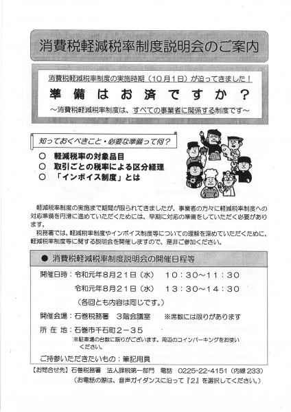 石巻税務署主催にて、消費税軽減税率制度説明会を開催致します。
