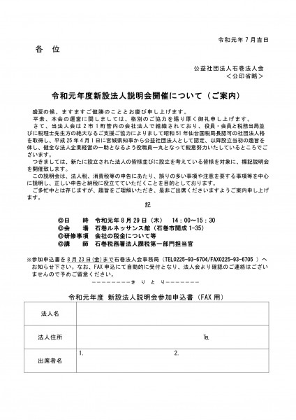 令和元年8月29日(木)石巻ルネッサンス館にて、本年度第1回目の新設法人説明会を開催致します。下記ご案内を確認いただき、FAXにてお申込みください。