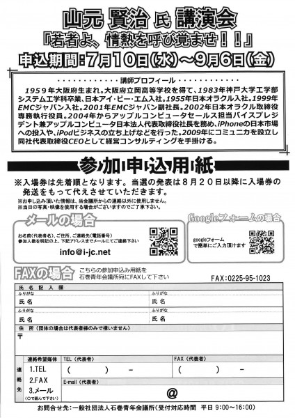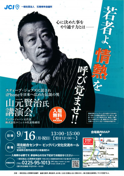 今回はiPhoneを日本へ広めた男として有名な元アップルジャパン代表取締役社長の山元賢治氏をお招きし、「若者よ、情熱を呼び覚ませ!!」の題でご講演されるようです。