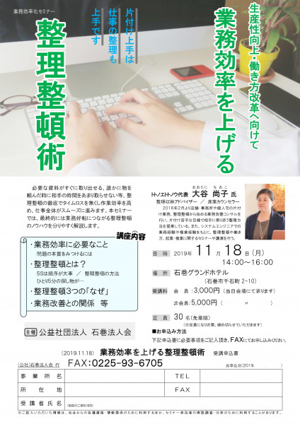 下記日程にて、「生産性向上・働き方改革へ向けて業務効率を上げる整理整頓」セミナーを開催いたします。