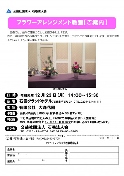 本年度も下記の日程にて、女性部会主催「フラワーアレンジメント教室」を開催致します。
