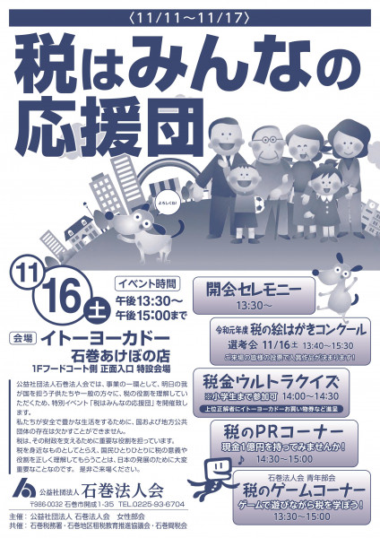本年度も税を考える週間(11月11日~11月17日)に合わせ、下記の日程にてイベント「税はみんなの応援団」を開催致します。