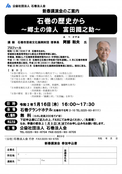 第1部の新春講演会は、当会広報誌「いしのまき」に掲載された記事に加筆・修正を行いこの度発刊された「石巻の歴史から~江戸時代から現代まで~」の著者であり、元石巻市教育長で現在は石巻市芸術文化振興財団理事長の阿部和夫氏を講師にお迎えして講演会を開催します。