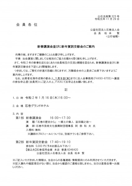 下記の日程にて、新春講演会並びに新年賀詞交歓会を開催致します。