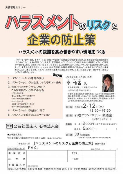 下記の日程にて、「ハラスメントのリスクと企業の防止策」セミナーを開催します。本研修ではハラスメント対策の基本的知識を身に付け、働きやすい職場を作ることを目的としております。この機会に是非ご受講ください。