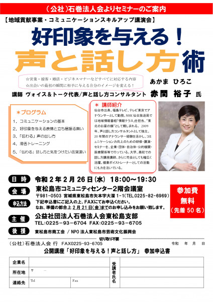 令和2年2月26日(水)18:00より東松島市コミュニティセンターにて、公開講演会を開催します。