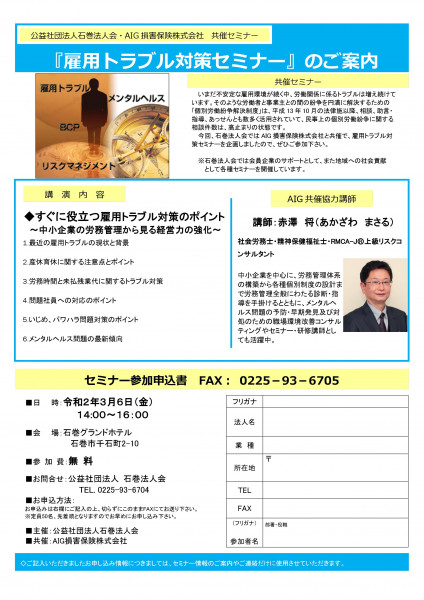 令和2年3月6日(金)石巻グランドホテルにて、「雇用トラブル対策セミナー」を開催します。