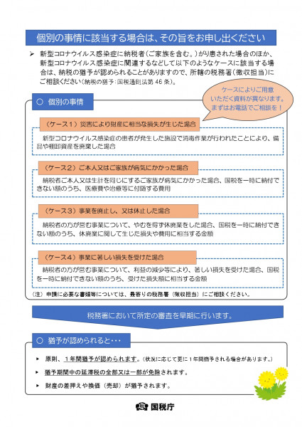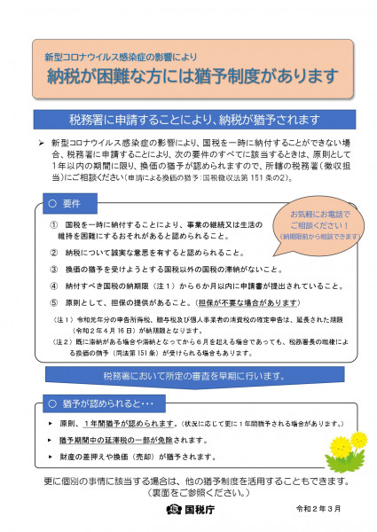 このため、国税庁では、新型コロナウイルス感染症の影響を受けた納税者の方向けに、猶予制度の周知のリーフレットを作成し、これまで以上に猶予制度に関する周知・広報に取り組んでおります。