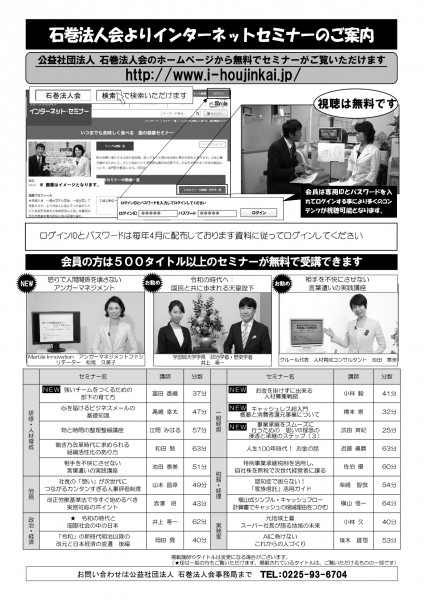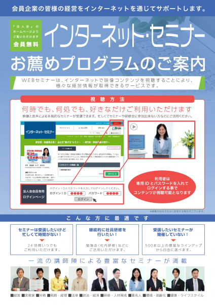 石巻法人会では、平成22年の10月より各種セミナーや研修会が中止会員の皆さまにいつでもご覧いただける「インターネット・セミナー」を無料で提供しております。
