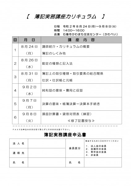 令和2年度8月24日(月)~9月8日(火)の期間にて、簿記実務講座を開催予定でございますが、参加申込人数が定員に達しましたので申込み受付を終了とさせていただきます。