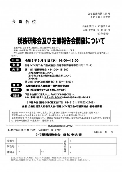 下記の日程にて、かほく支部主催の税務研修会を開催致します。