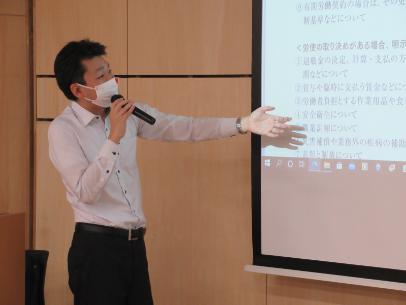 第1回の講師は社会保険労務士の森 暁彦 氏にお越しいただき、労働基準法についてご解説いただきました。森先生は本講座の講師を務めていただき7年目になりました。ご説明も大変分かり易く、講義終了後もご質問に丁寧に対応していただきました。