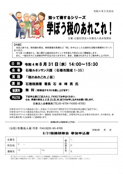 女性部会では、下記の日程で「知って得するシリーズ 学ぼう税のあれこれ!」と題し、税務研修会を開催します。