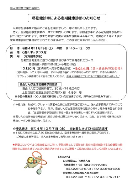 下記の日程にて、移動検診車による定期健康診断を実施いたします。