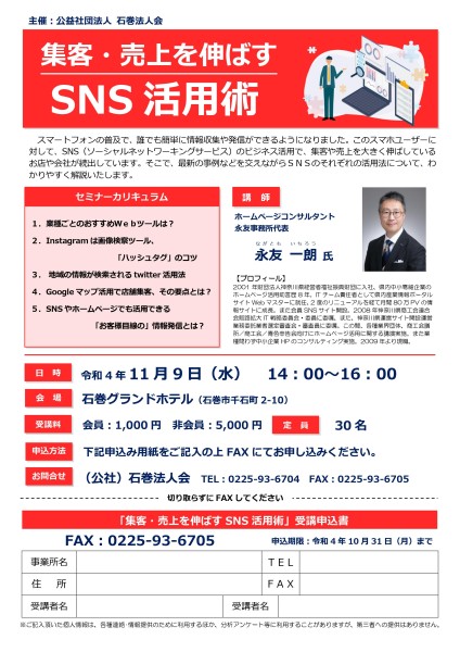 下記チラシへ記載の日程にて、「集客・売上を伸ばすSNS活用術」セミナーを開催します。