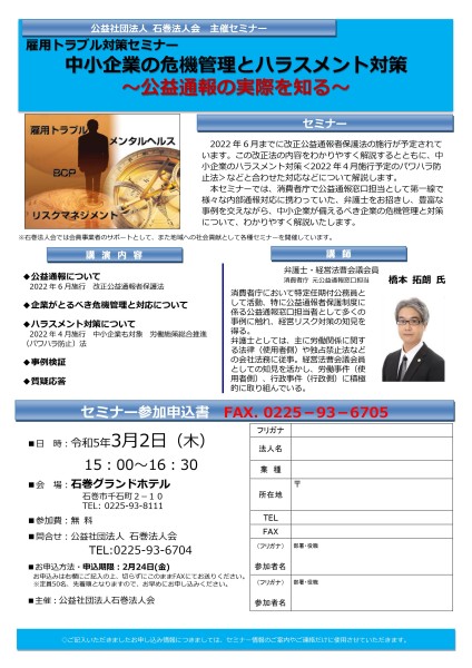 令和5年3月2日(木)石巻グランドホテルにて「中小企業の危機管理とハラスメント対策」セミナーを開催します。