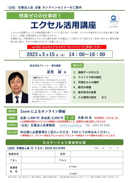 令和5年3月15日(水)残業ゼロの仕事術!「エクセル活用講座」を開催します。