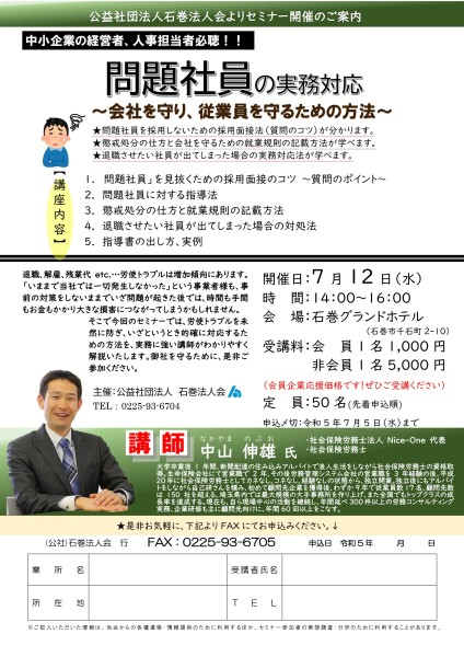 令和5年7月12日(水)石巻グランドホテルにて「問題社員の実務対応」セミナーを開催いたします。