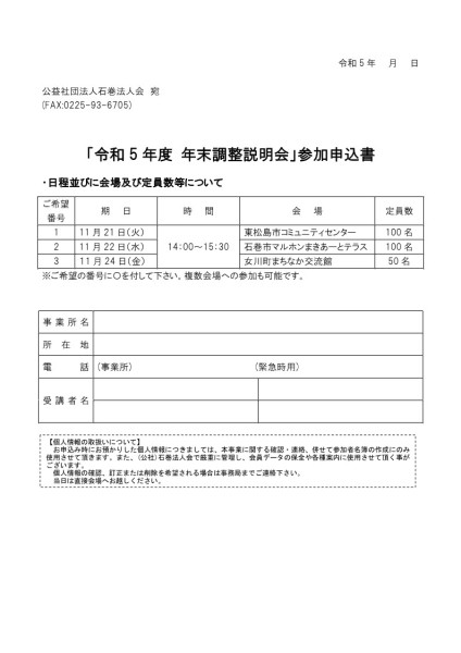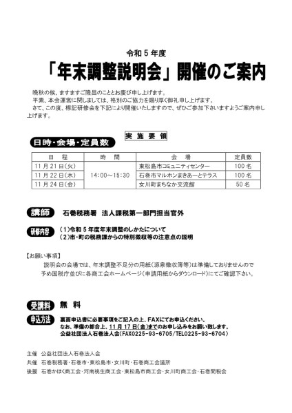 令和5年11月21(火)・22(水)・24(金)の3日間、管内各所にて「令和5年度年末調整説明会」を開催いたします。