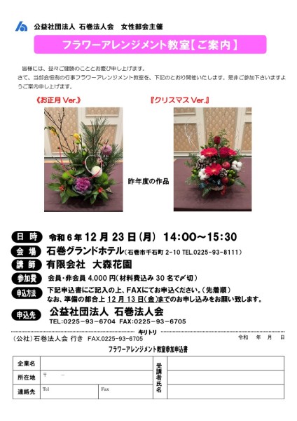 令和6年12月23日(月)石巻グランドホテルにて、女性部会主催「フラワーアレンジメント教室」を開催いたします。