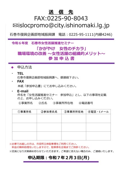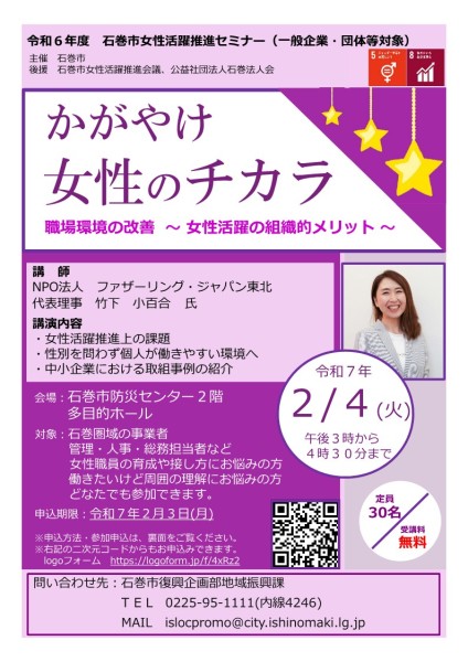 当会では、令和7年2月4日(火)に開催される、令和6年度石巻市女性活躍推進セミナーへ後援しております。