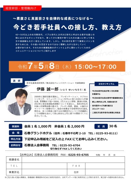 令和7年5月8日(木)石巻グランドホテルにて「今どき若手社員への接し方、教え方」セミナーを開催します。