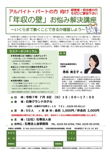 令和7年7月8日(火)石巻グランドホテルにて「年収の壁」お悩み解決講座を開催いたします。