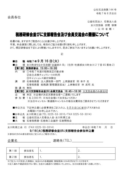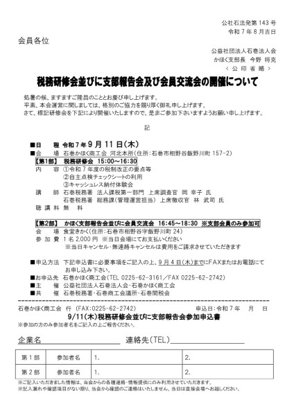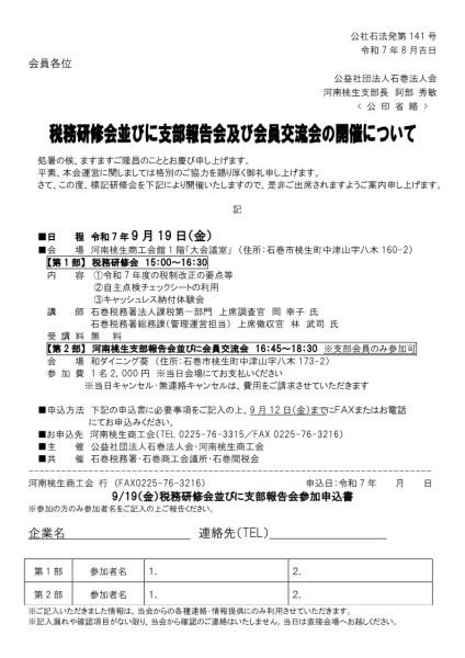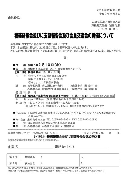 各支部にて、税務研修会並びに支部報告会を開催します。終了後には、会員交流会も実施しますので、ぜひご参加ください。