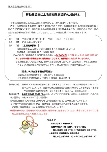 本年最後の「移動検診車による定期健康診断」開催のご案内です。