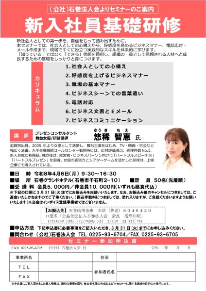 令和8年4月6日(月)石巻グランドホテルにて新入社員セミナーを開催します。
