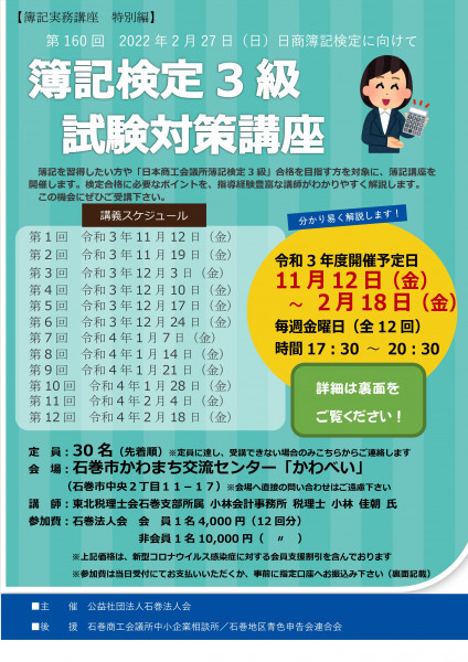 今回は講師の東北税理士会様と石巻支部所属税理士の小林 佳朝 氏のご協力を得て全12回の講座とし、2月27日(日)に行われる日商簿記検定3級試験対策専用の特別講座として開催します。