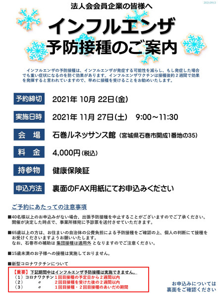 インフルエンザ予防接種を下記の日程にて開催いたします。