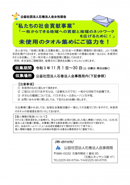 女性部会では、本年度も社会貢献事業の取り組みとして「未使用タオルの収集活動」を実施いたします。