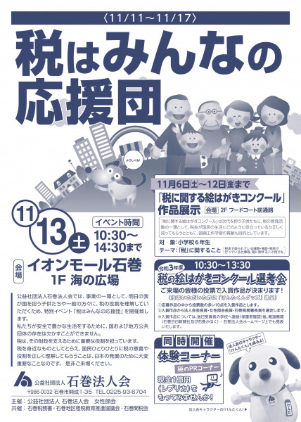 令和3年11月13日(土)10:30より、イオンモール石巻1階海の広場にて税を考える週間イベント「税はみんなの応援団」を開催いたします。