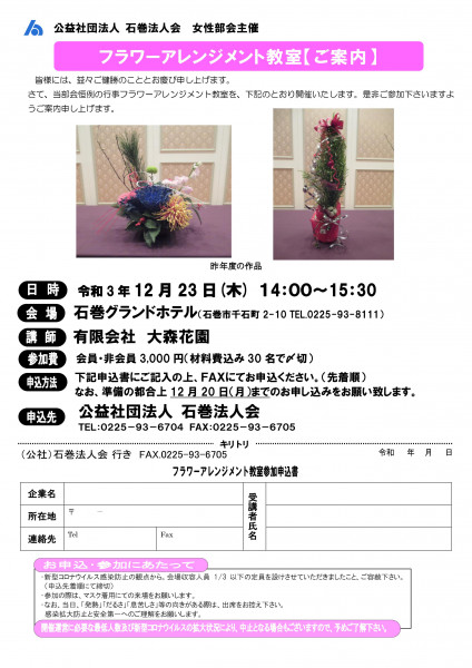 令和3年12月23日(木)石巻グランドホテルにて、女性部会主催「フラワーアレンジメントセミナー」を開催し27名が参加しました。